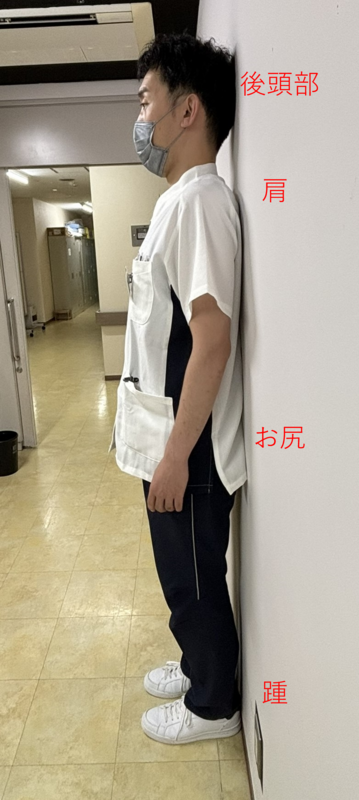 • 立った状態で真っすぐな壁に背中を合わせます