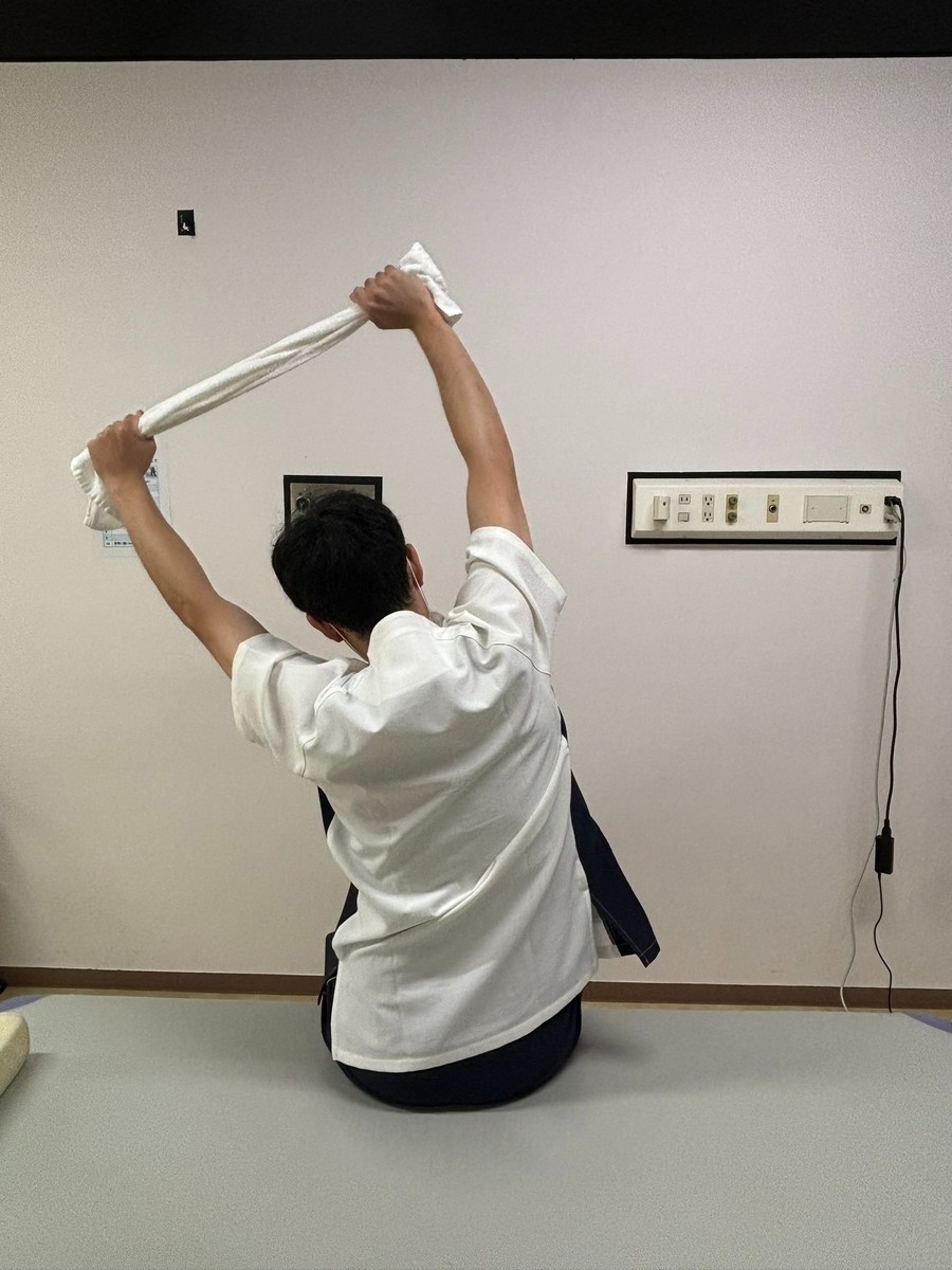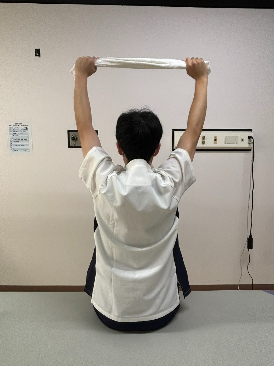 ・タオルを肩幅ぐらいの間隔で両手で持ちます。